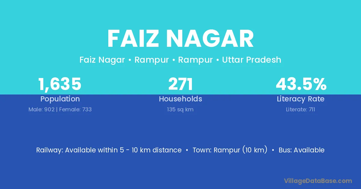 Rampur (10 km) is the nearest town to Faiz Nagar village for major economic activities and is located approximately 10 km away.
