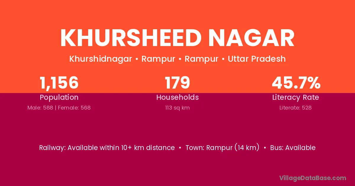 Rampur (14 km) is the nearest town to Khursheed Nagar village for major economic activities and is located approximately 14 km away.