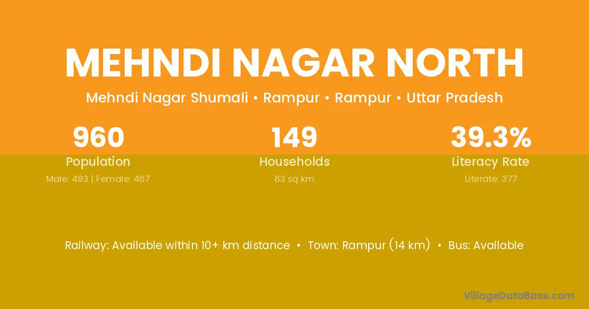 Rampur (14 km) is the nearest town to Mehndi Nagar North village for major economic activities and is located approximately 14 km away.