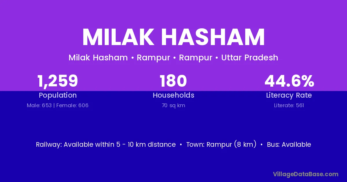 Rampur (8 km) is the nearest town to Milak Hasham village for major economic activities and is located approximately 8 km away.