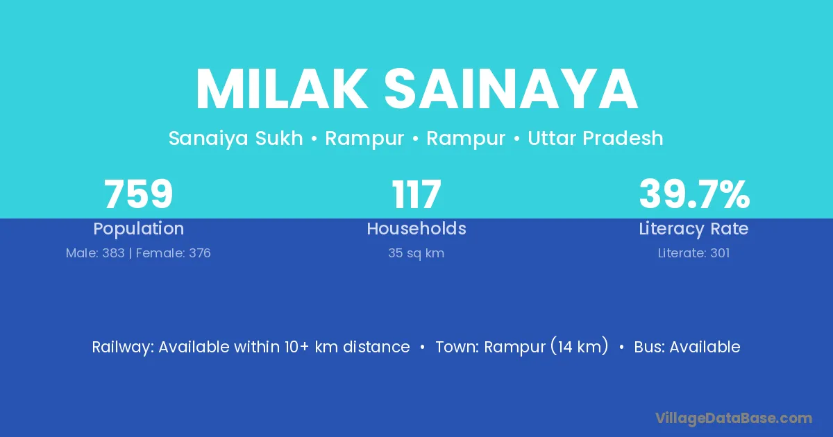 Rampur (14 km) is the nearest town to Milak Sainaya village for major economic activities and is located approximately 14 km away.