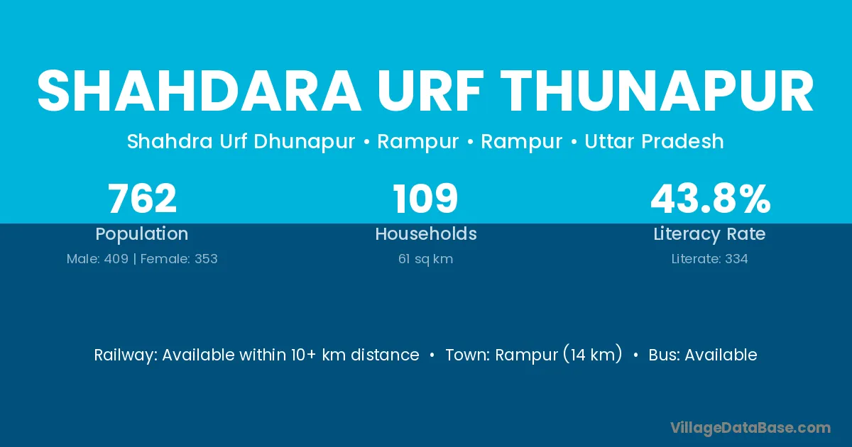 Rampur (14 km) is the nearest town to Shahdara Urf Thunapur village for major economic activities and is located approximately 14 km away.
