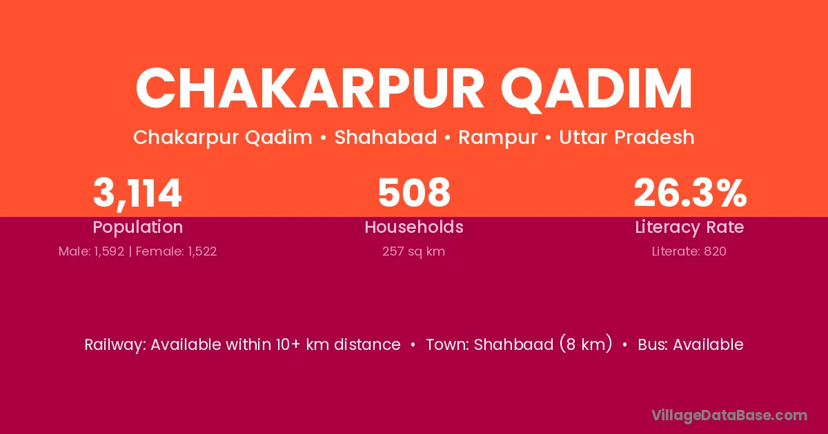 Chakarpur Qadim village has a total population of 3,114 people, of which 1,592 are males and 1,522 are females.