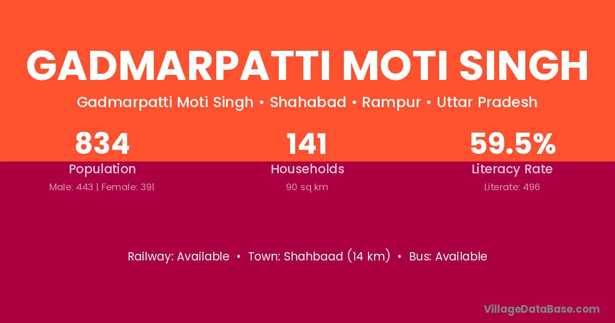 Gadmarpatti Moti Singh village has a total population of 834 people, of which 443 are males and 391 are females.