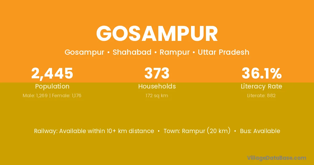 Rampur (20 km) is the nearest town to Gosampur village for major economic activities and is located approximately 20 km away.