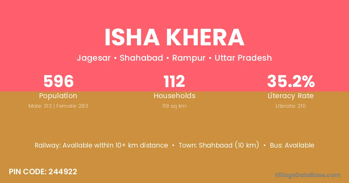 Isha Khera village has a total population of 596 people, of which 313 are males and 283 are females.