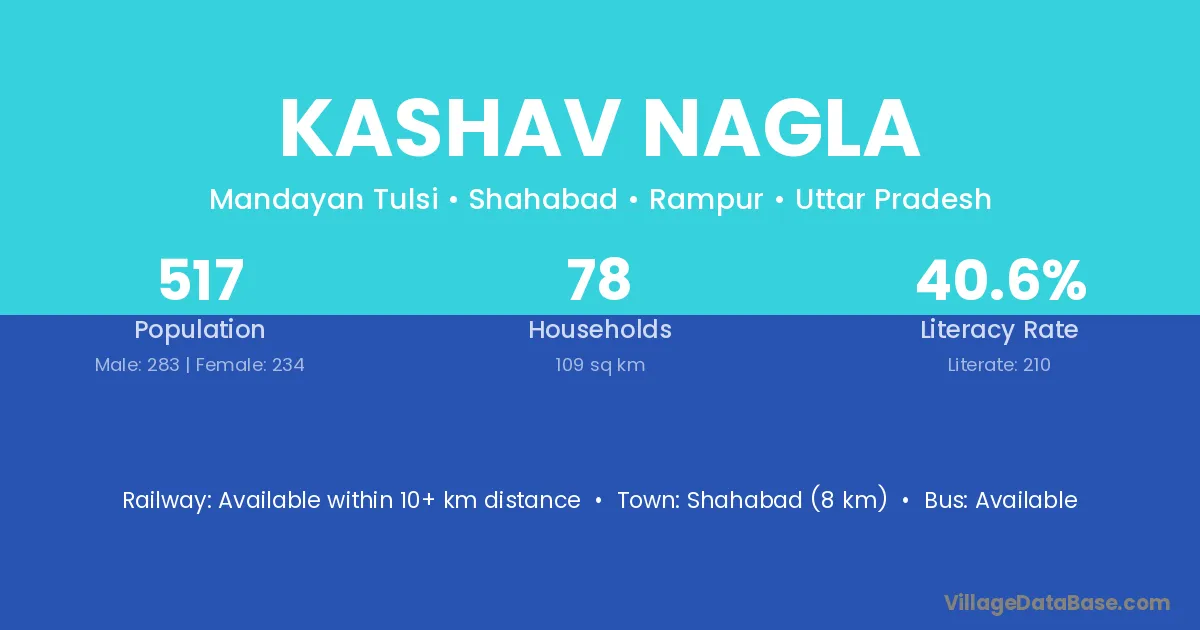 Kashav Nagla village has a total population of 517 people, of which 283 are males and 234 are females.
