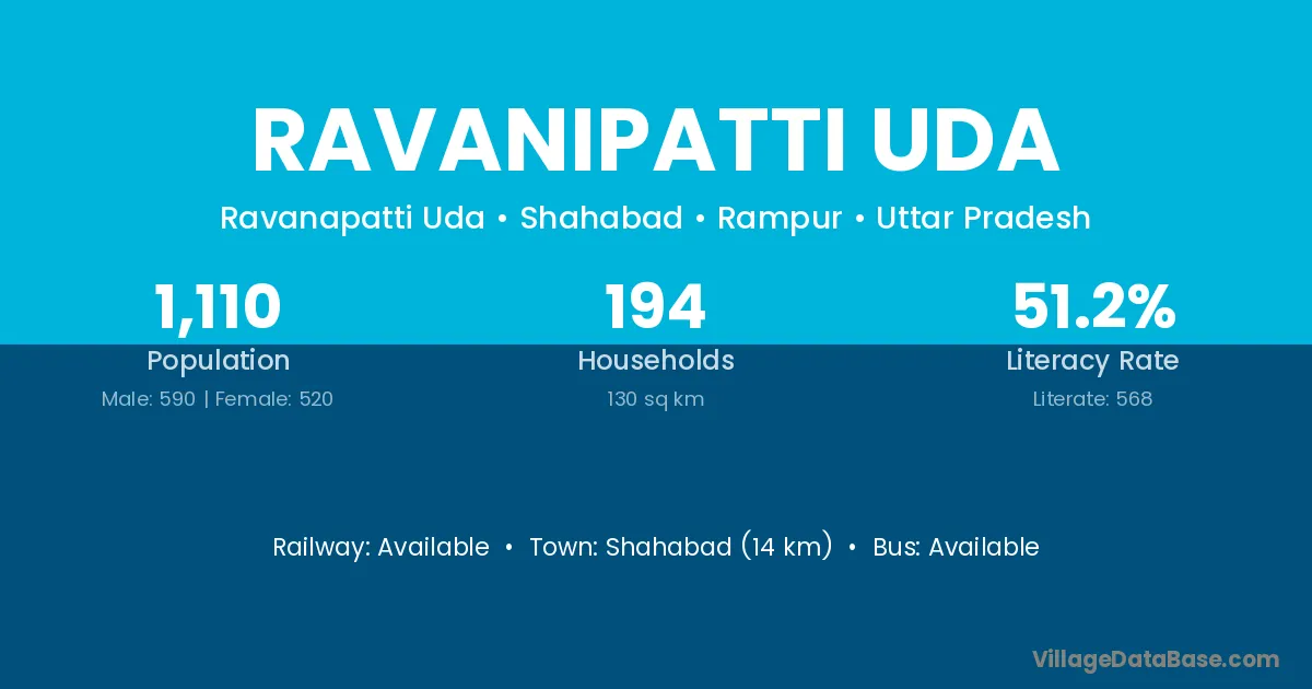 Shahabad (14 km) is the nearest town to Ravanipatti Uda village for major economic activities and is located approximately 14 km away.