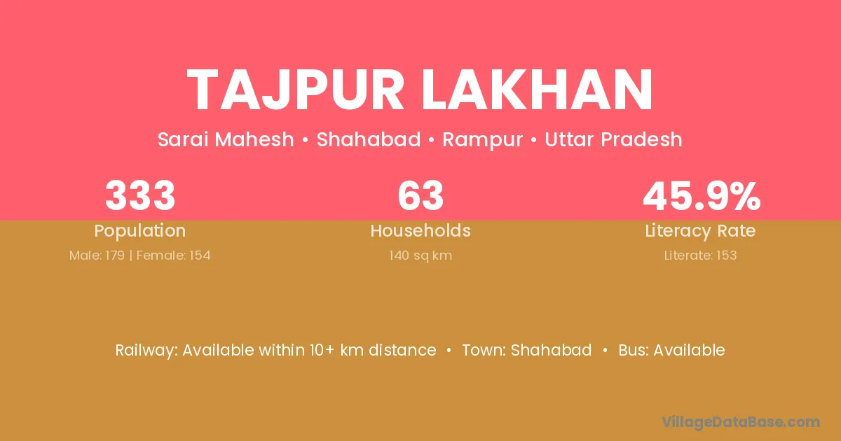 Tajpur Lakhan village has a total population of 333 people, of which 179 are males and 154 are females.