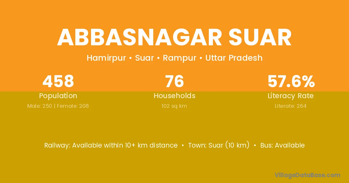 Abbasnagar Suar village has a total population of 458 people, of which 250 are males and 208 are females.