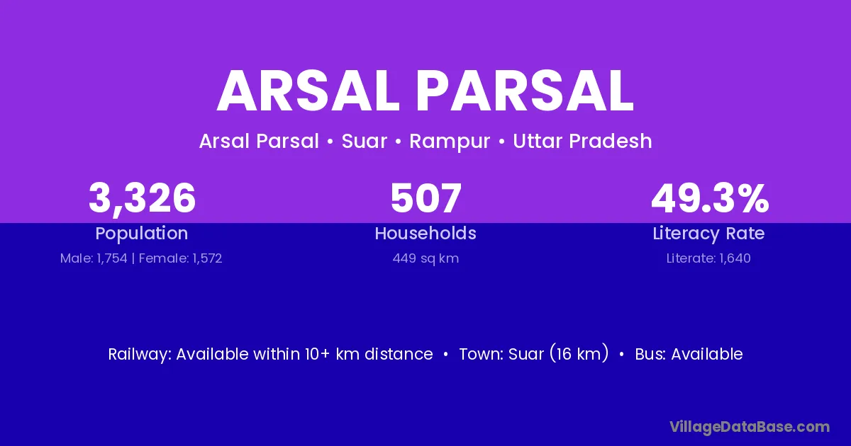 Suar (16 km) is the nearest town to Arsal Parsal village for major economic activities and is located approximately 16 km away.