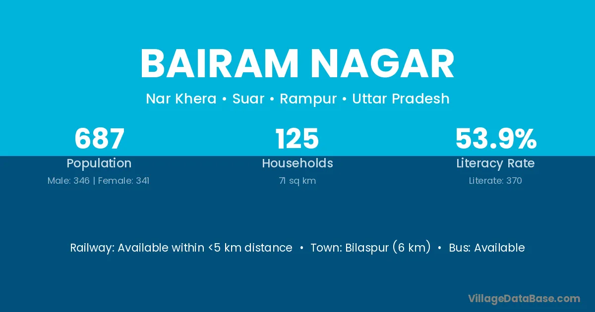 Bairam Nagar village has a total population of 687 people, of which 346 are males and 341 are females.