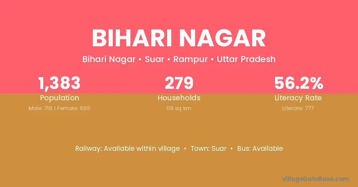 Bihari Nagar village has a total population of 1,383 people, of which 718 are males and 665 are females.