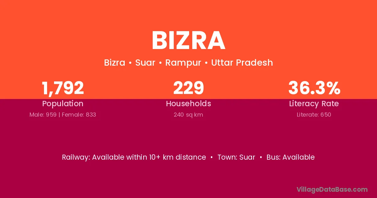Bizra village has a total population of 1,792 people, of which 959 are males and 833 are females.