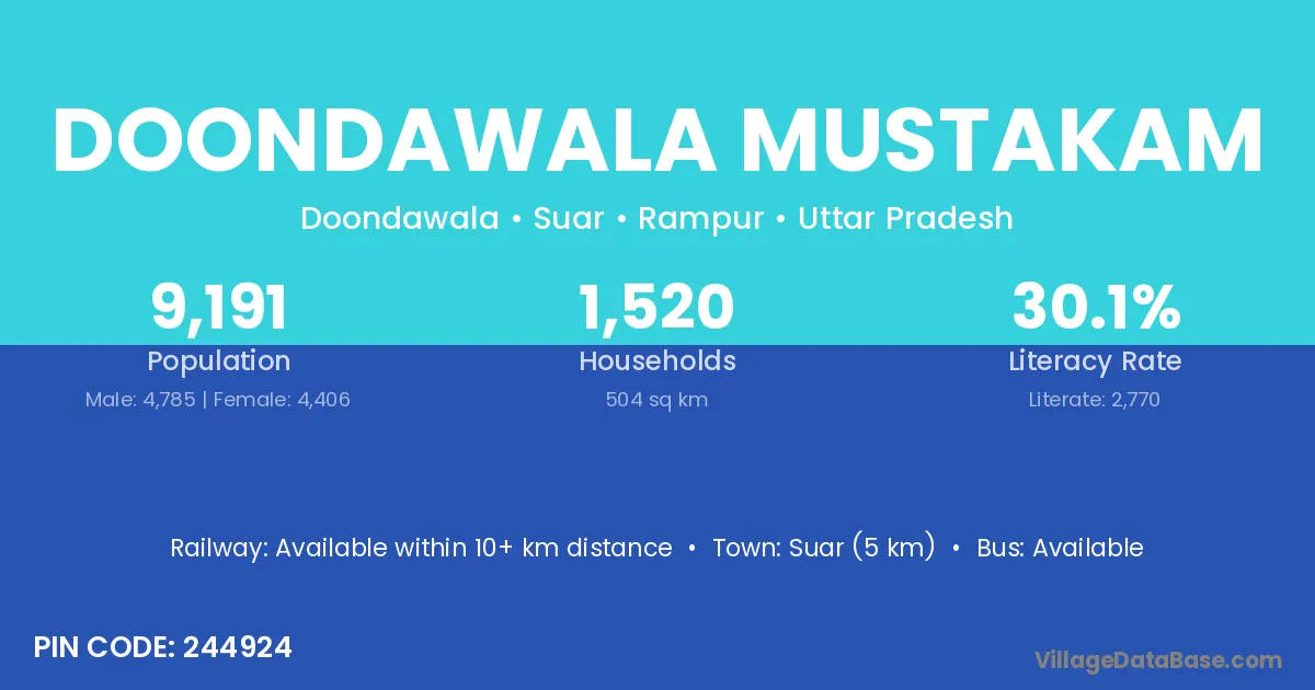 Suar (5 km) is the nearest town to Doondawala Mustakam village for major economic activities and is located approximately 5 km away.