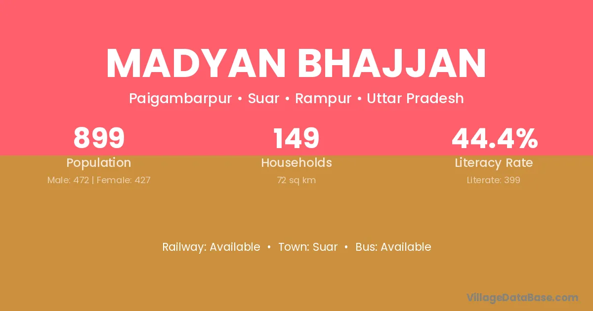 Madyan Bhajjan village has a total population of 899 people, of which 472 are males and 427 are females.