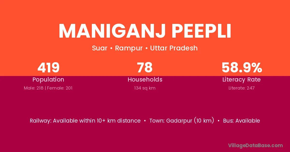 Maniganj Peepli village has a total population of 419 people, of which 218 are males and 201 are females.