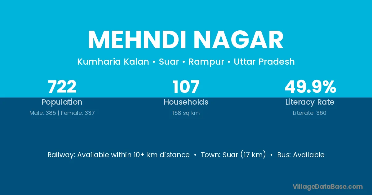 Suar (17 km) is the nearest town to Mehndi Nagar village for major economic activities and is located approximately 17 km away.