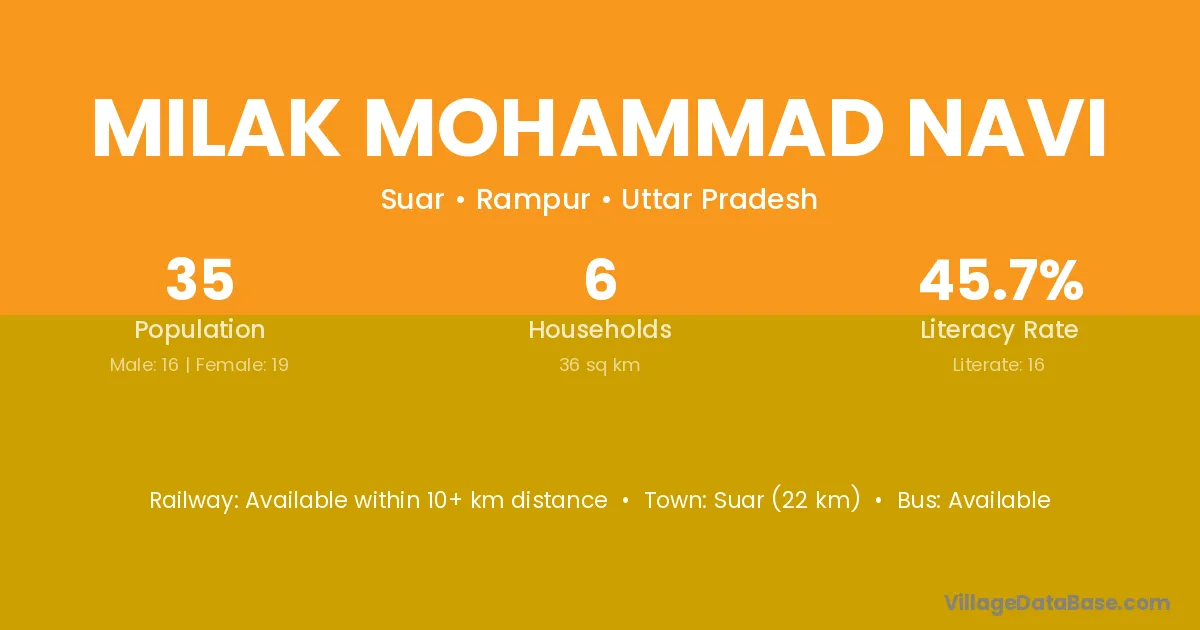 Suar (22 km) is the nearest town to Milak Mohammad Navi village for major economic activities and is located approximately 22 km away.