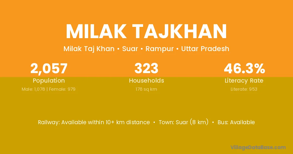 Suar (8 km) is the nearest town to Milak Tajkhan village for major economic activities and is located approximately 8 km away.