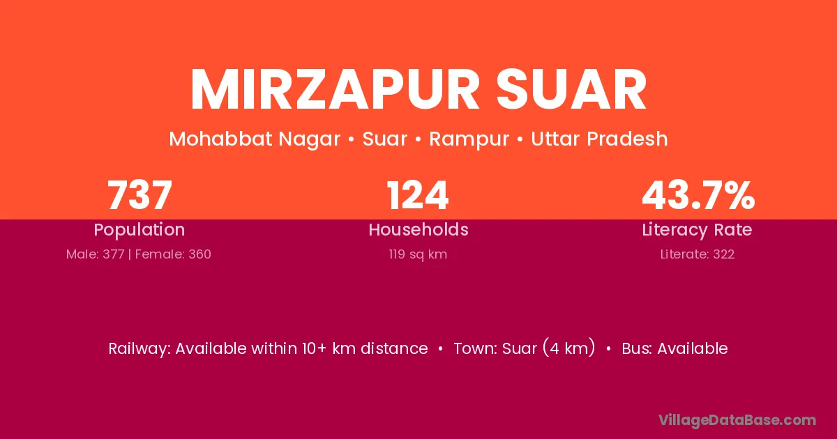 Suar (4 km) is the nearest town to Mirzapur Suar village for major economic activities and is located approximately 4 km away.