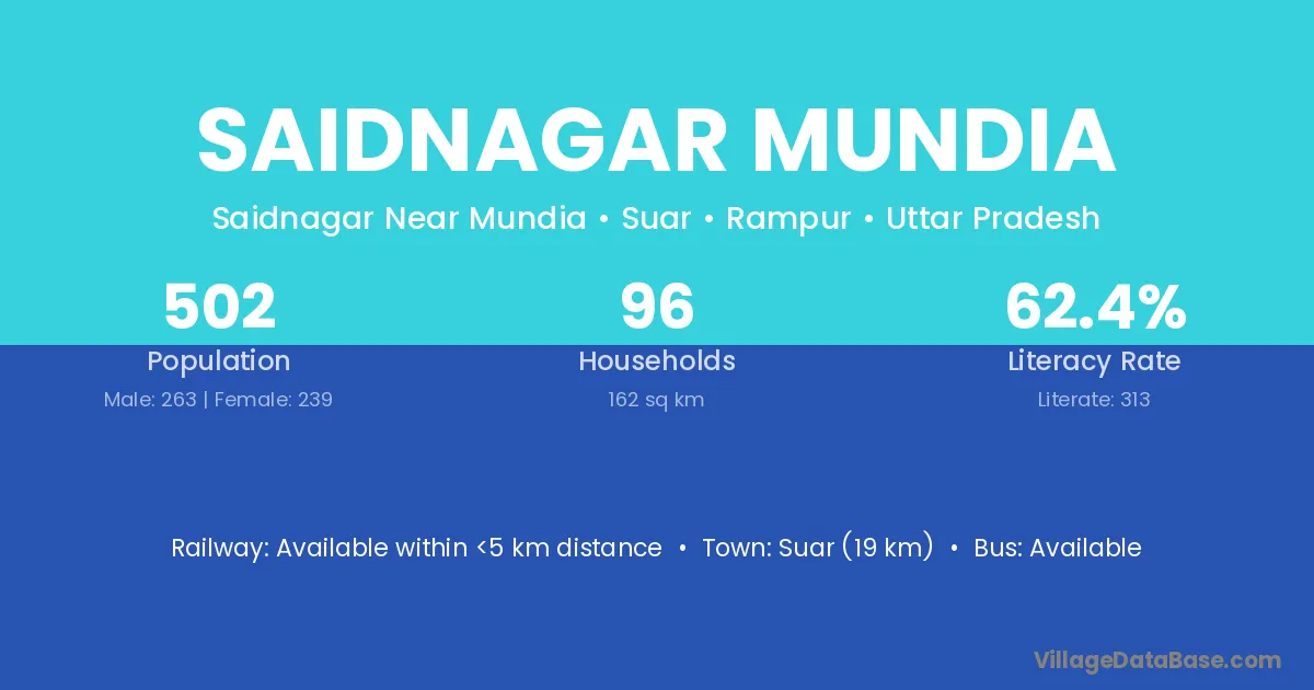 Suar (19 km) is the nearest town to Saidnagar Mundia village for major economic activities and is located approximately 19 km away.