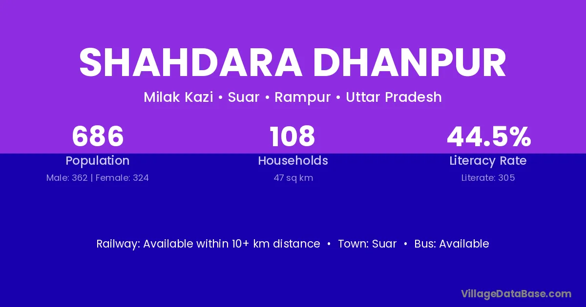 Shahdara Dhanpur village has a total population of 686 people, of which 362 are males and 324 are females.