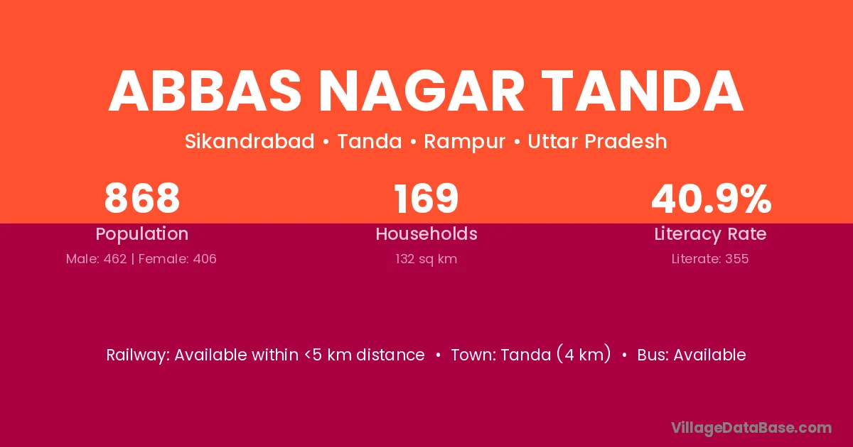 Abbas Nagar Tanda village has a total population of 868 people, of which 462 are males and 406 are females.