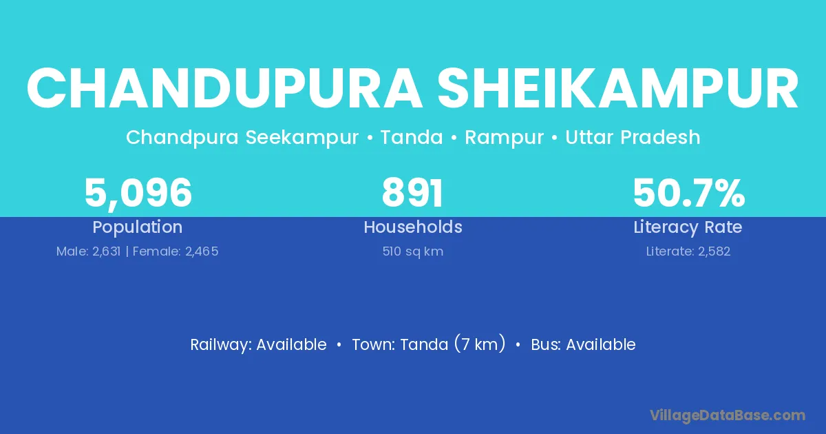 Chandupura Sheikampur village has a total population of 5,096 people, of which 2,631 are males and 2,465 are females.