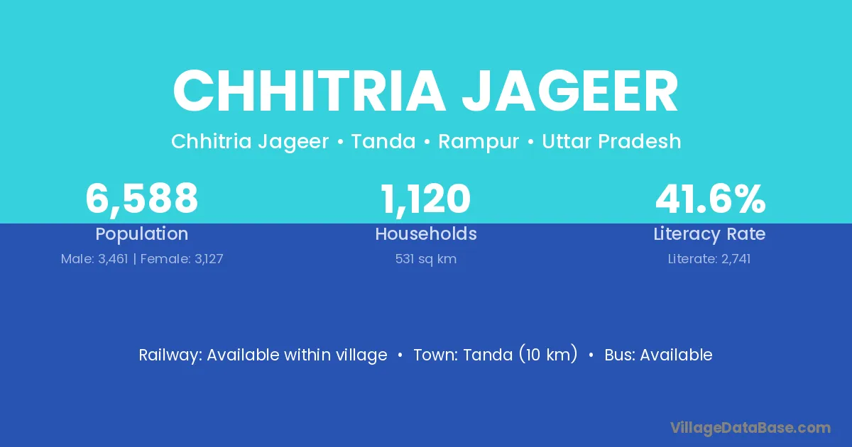 Tanda (10 km) is the nearest town to Chhitria Jageer village for major economic activities and is located approximately 10 km away.
