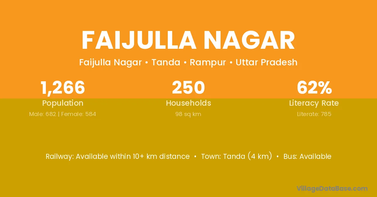 Tanda (4 km) is the nearest town to Faijulla Nagar village for major economic activities and is located approximately 4 km away.