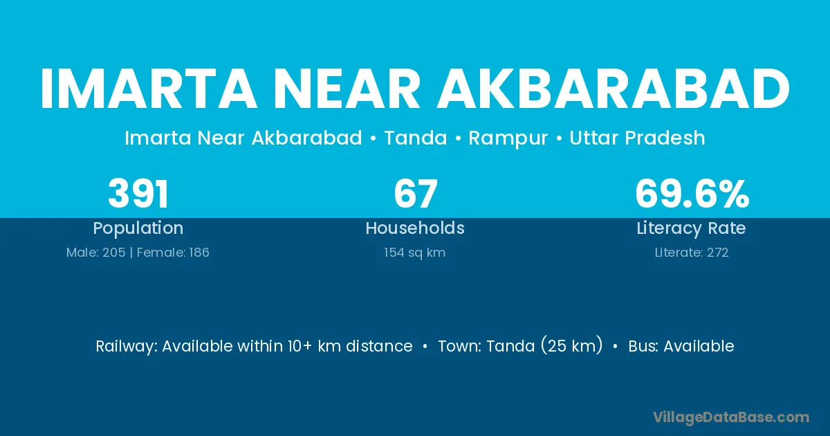 Tanda (25 km) is the nearest town to Imarta Near Akbarabad village for major economic activities and is located approximately 25 km away.