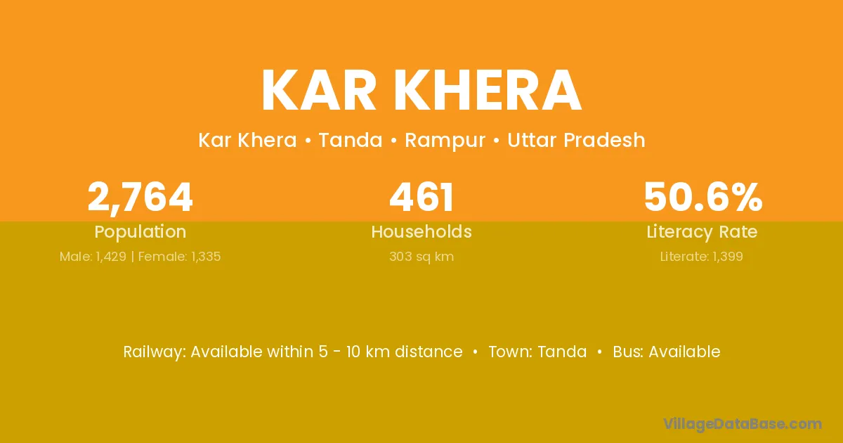 Kar Khera village has a total population of 2,764 people, of which 1,429 are males and 1,335 are females.