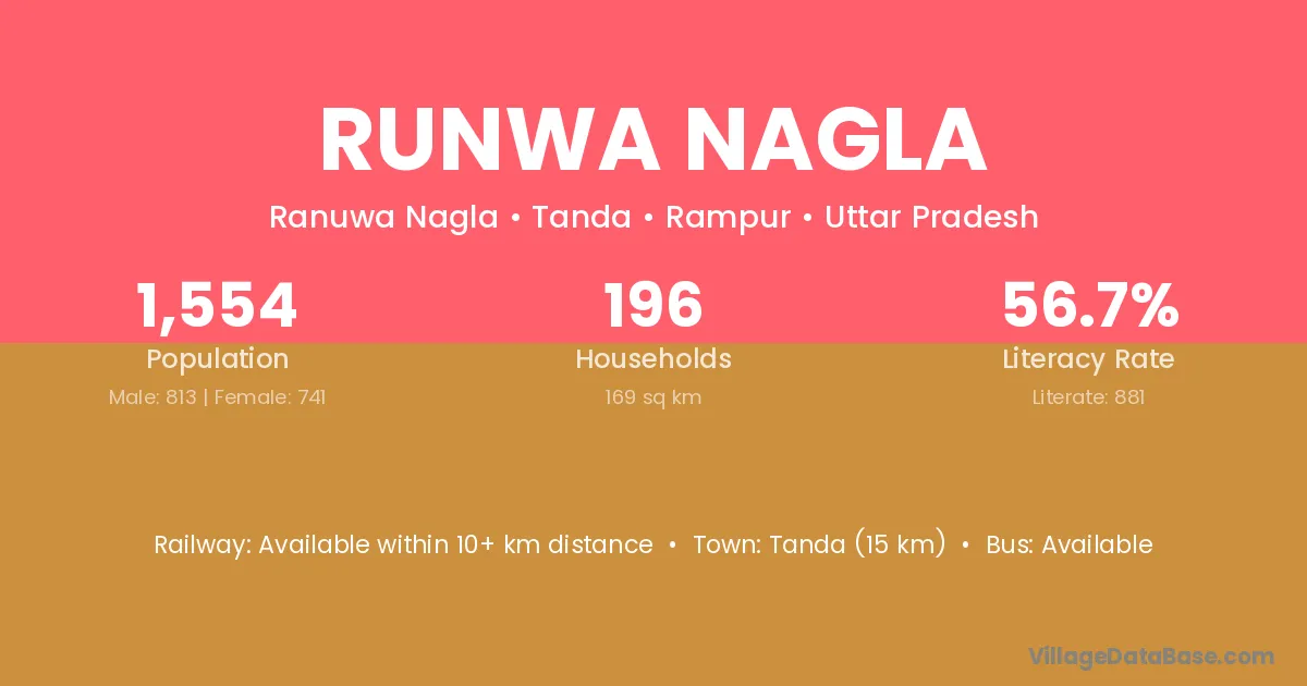 Runwa Nagla village has a total population of 1,554 people, of which 813 are males and 741 are females.