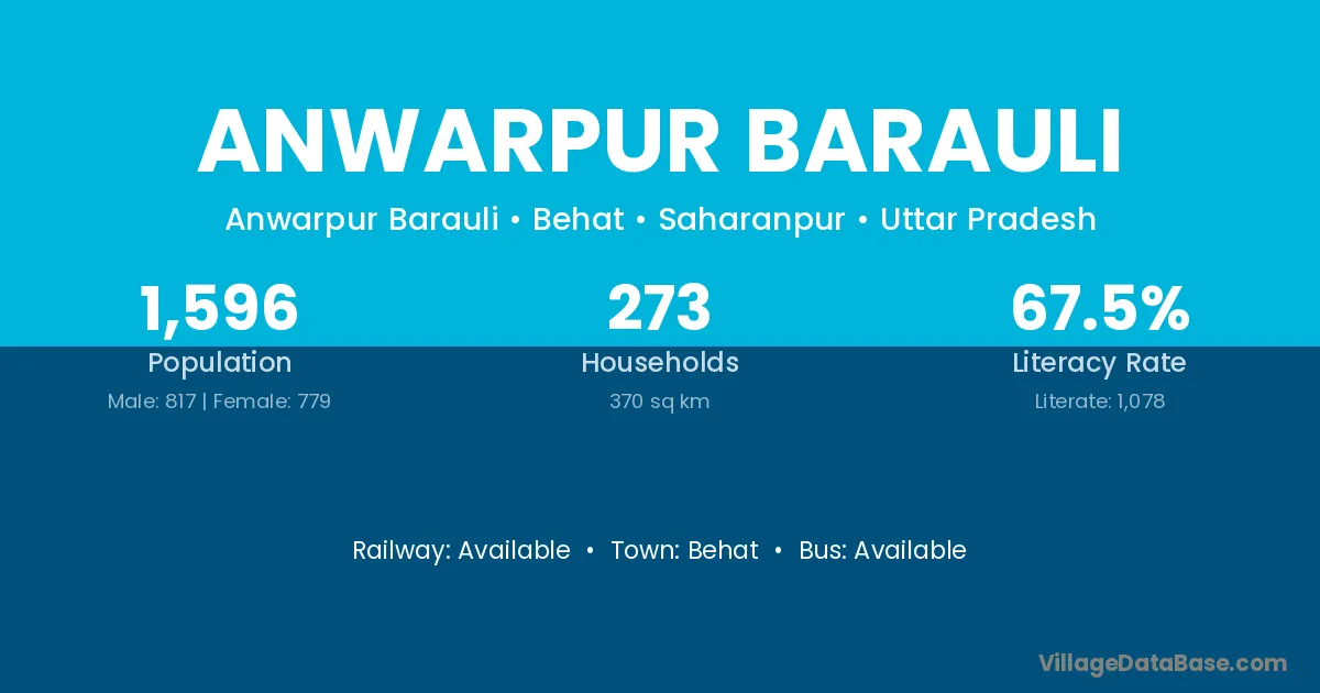 Anwarpur Barauli village has a total population of 1,596 people, of which 817 are males and 779 are females.