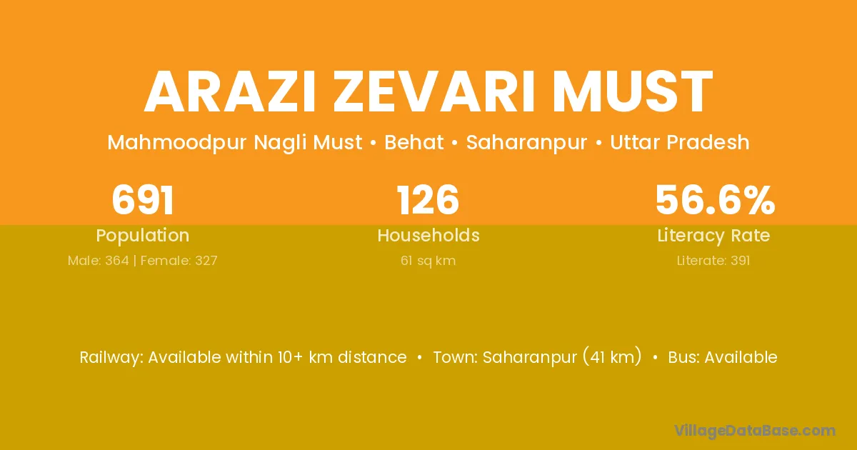 Saharanpur (41 km) is the nearest town to Arazi Zevari Must village for major economic activities and is located approximately 41 km away.
