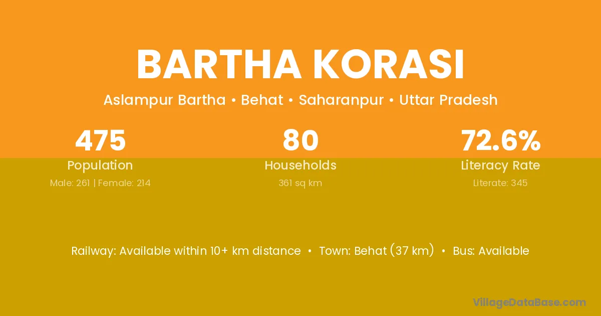 Bartha Korasi village has a total population of 475 people, of which 261 are males and 214 are females.