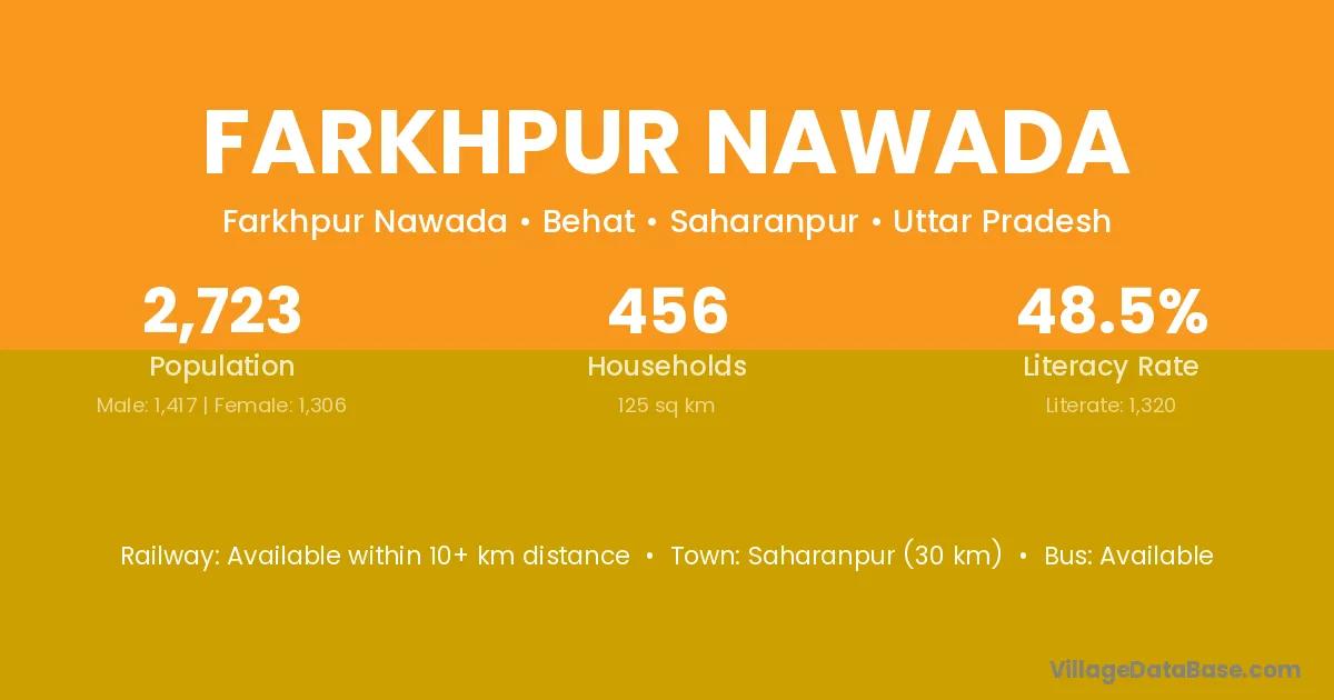 Saharanpur (30 km) is the nearest town to Farkhpur Nawada village for major economic activities and is located approximately 30 km away.