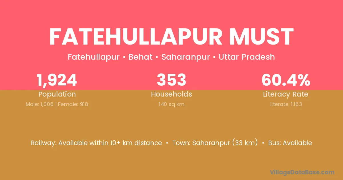 Saharanpur (33 km) is the nearest town to Fatehullapur Must village for major economic activities and is located approximately 33 km away.