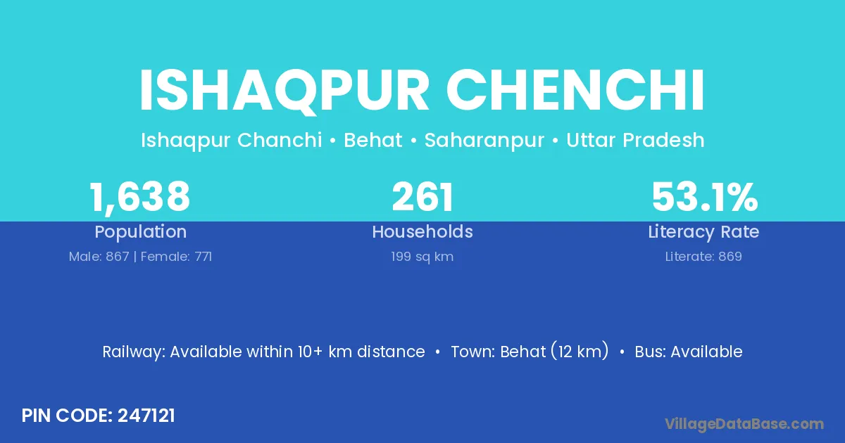 Behat (12 km) is the nearest town to Ishaqpur Chenchi village for major economic activities and is located approximately 12 km away.