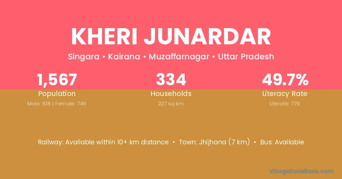 The literacy rate of Kheri Junardar village is 61.28%. Male literacy stands at 69.49% and female literacy at 51.72%.