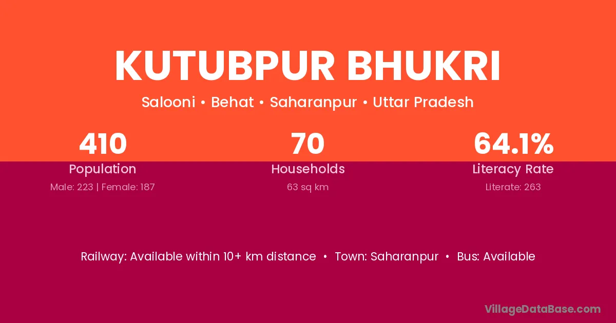Kutubpur Bhukri village has a total population of 410 people, of which 223 are males and 187 are females.