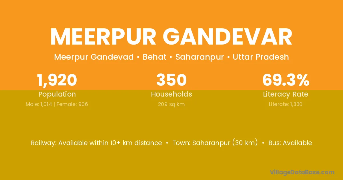 Saharanpur (30 km) is the nearest town to Meerpur Gandevar village for major economic activities and is located approximately 30 km away.