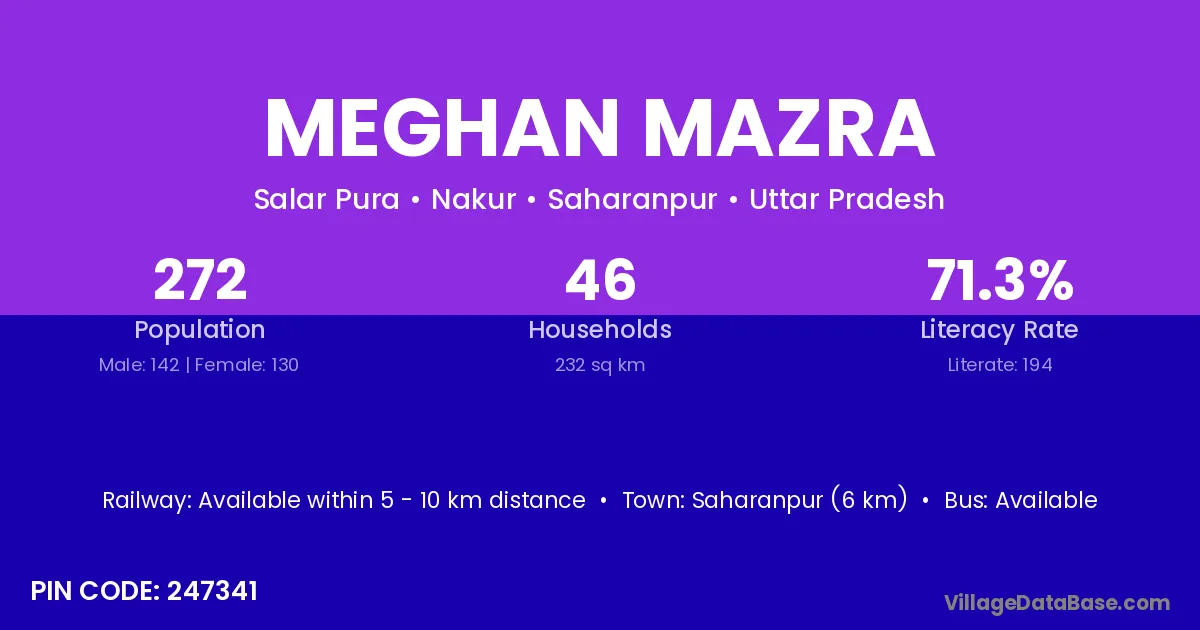 Saharanpur (24 km) is the nearest town to Meghan Mazra village for major economic activities and is located approximately 24 km away.