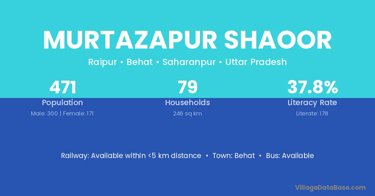 Murtazapur Shaoor village has a total population of 471 people, of which 300 are males and 171 are females.