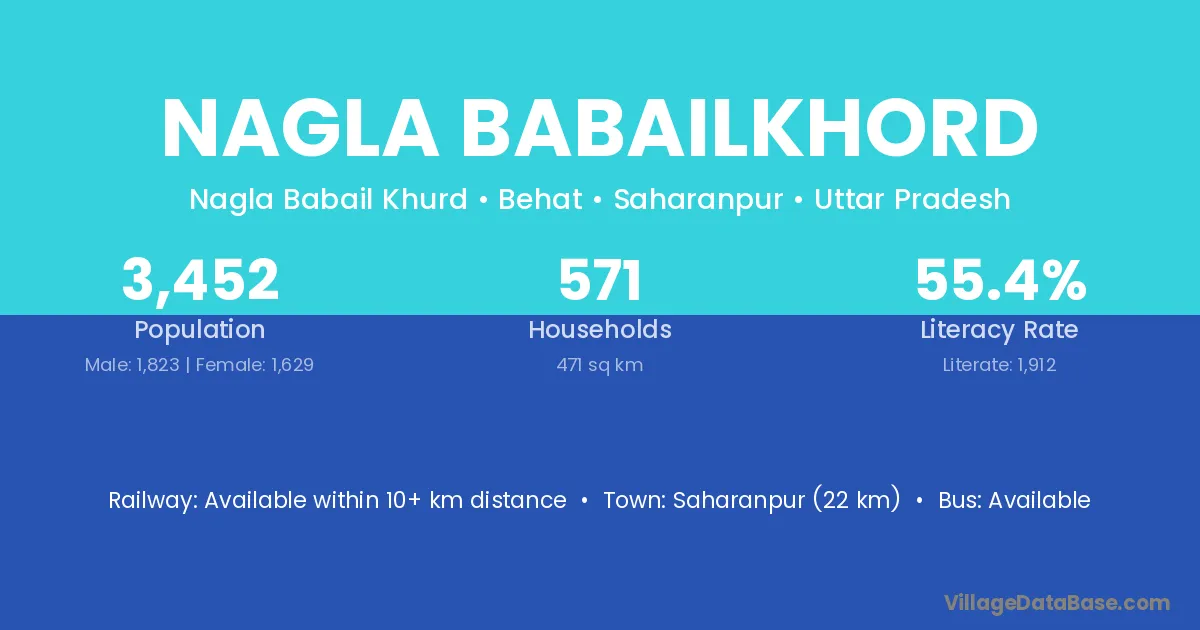 Saharanpur (22 km) is the nearest town to Nagla Babailkhord village for major economic activities and is located approximately 22 km away.
