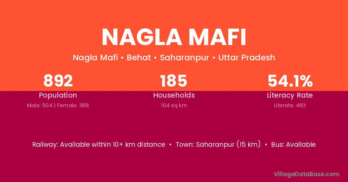 Saharanpur (15 km) is the nearest town to Nagla Mafi village for major economic activities and is located approximately 15 km away.