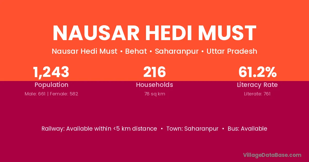 Nausar Hedi Must village has a total population of 1,243 people, of which 661 are males and 582 are females.