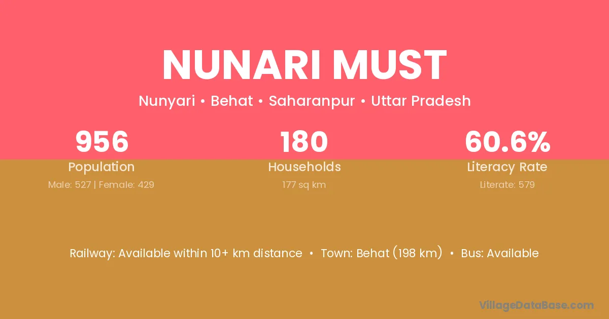 Behat (198 km) is the nearest town to Nunari Must village for major economic activities and is located approximately 198 km away.