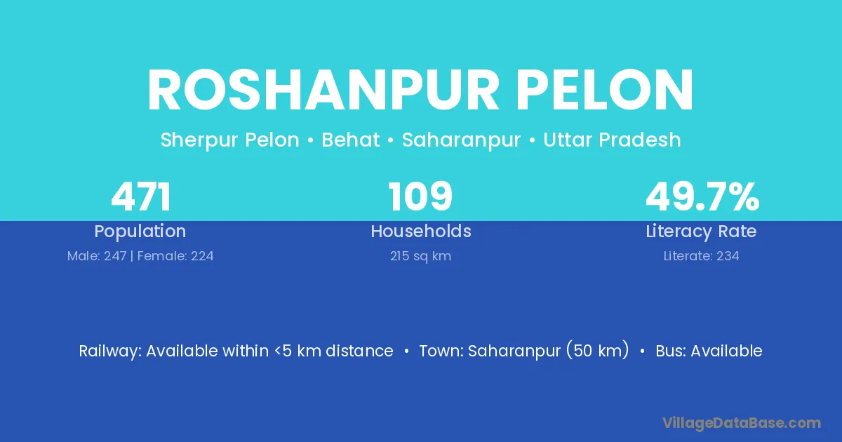 Saharanpur (50 km) is the nearest town to Roshanpur Pelon village for major economic activities and is located approximately 50 km away.